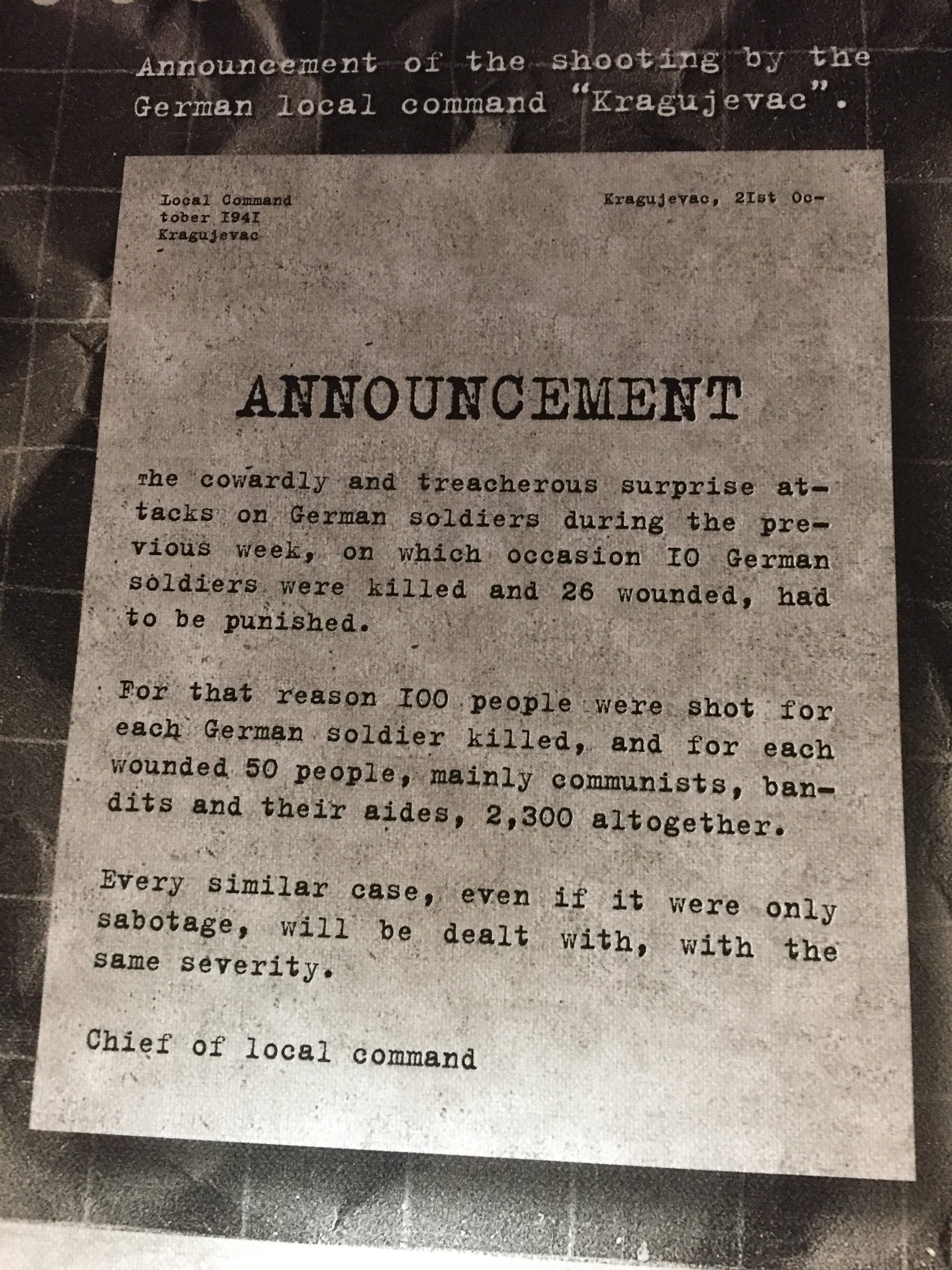 The beginning of our day was a visit to ’21 October Museum’ in the Šumarice Memorial Park, which is a memorial to an event in history. During World War Two there were reprisal killings happening throughout Eastern Europe. The Kragujevac massacre was the killing of between 2,778 and 2,794 mostly Serb men and boys by German soldiers on 21 October 1941. It was a reprisal for attacks by the resistance in the Gornji Milanovac district that resulted in the deaths of 10 German soldiers and the wounding of 26 others. The number of hostages to be shot was calculated as a ratio of 100 hostages executed for every German soldier killed and 50 hostages executed for every German soldier wounded.